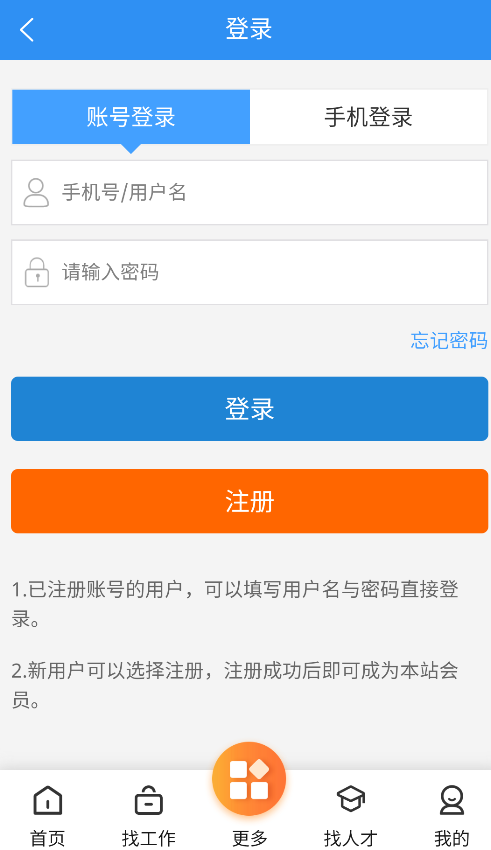 3、返回登录页面,使用刚注册的账号密码即可登录,开启求职/招聘服务。