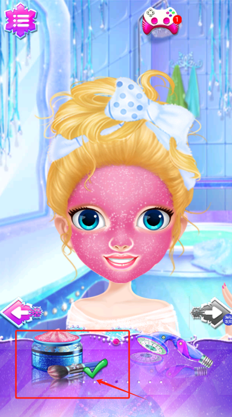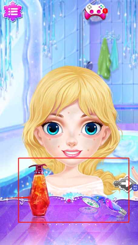 2、选择浴室场景里的橙色瓶子,给金发女孩做面部清洁,准备化妆。