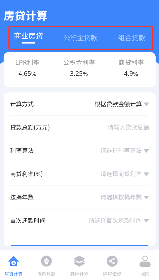 1、启动APP后,在“贷款计算”专区选择贷款类型(商业/公积金/组合),输入金额、年限即可生成月供明细(含利息总额)。