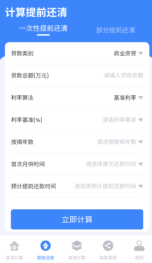 2、进入“提前还款”模拟器,选择一次性结清或部分提前还款,系统自动计算节省的利息和最优还款方案。