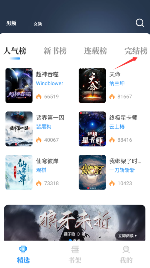 1、进入海鱼小说APP后,在首页导航栏选择"完结榜单"栏目,这里展示已完结的优质小说作品。