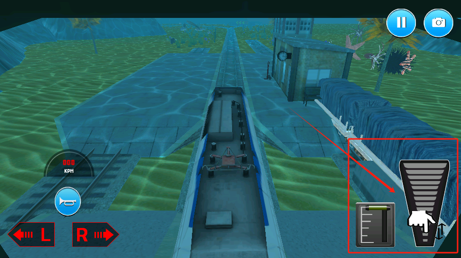 3、控制火车前进,看右边红框按钮调速,左下角L和R是转向,速度显示在中间。