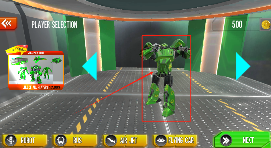 1、选红框里的绿色机器人,点NEXT确认,花500金币或17.99美元解锁全部角色。