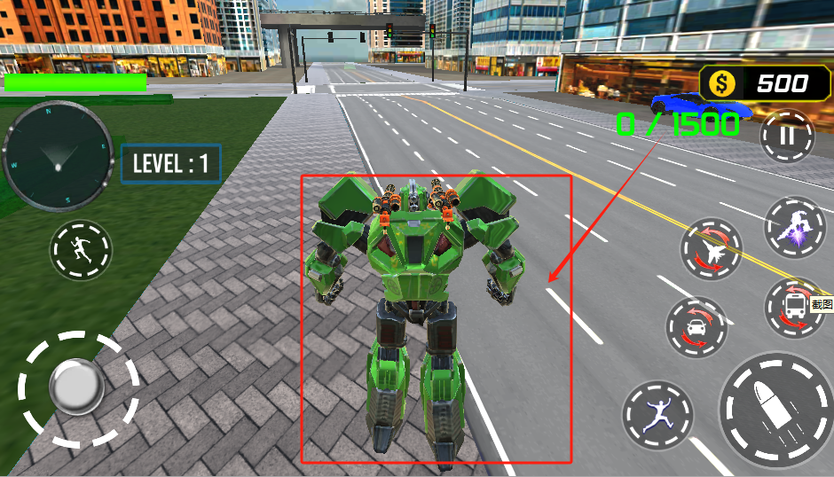 3、控制绿机器人移动,看左上角等级和金币,完成1500分过关,现在0分。