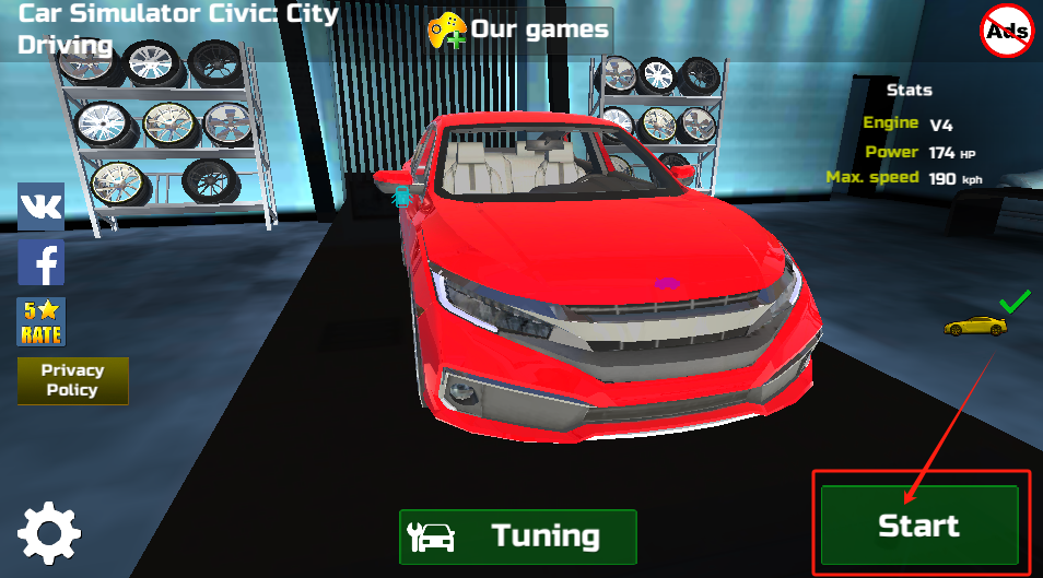 1、点右下角Start按钮开始游戏,左边可以改装车辆,上面显示引擎参数。