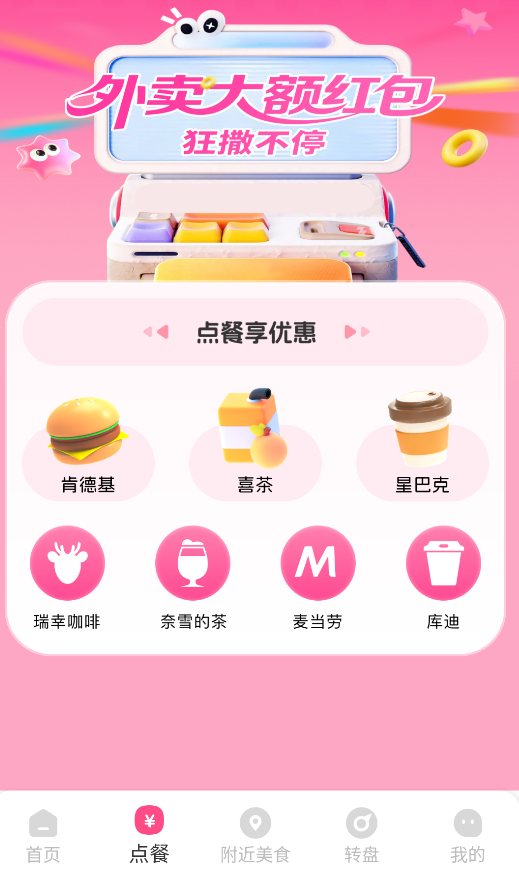 外卖优惠APP挺实用的,专门帮你找各种外卖红包和折扣。打开就能领全城的外卖优惠券,点餐时直接抵扣,比原价便宜不少。里面经常搞活动,能抢到更划算的补贴。最方便的是有个转盘功能,不知道吃啥的时候转一下,随机推荐附近美食,治好了我的选择困难症。经常点外卖的可以试试,确实能省不少钱。