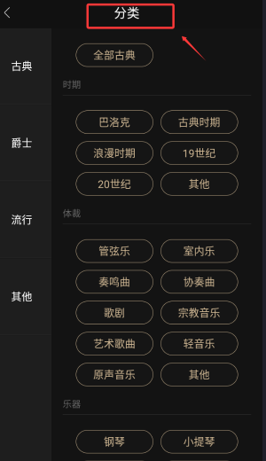 2、在音乐分类专区可按古典、爵士等流派筛选作品,或根据解析度等级选择适合设备播放的音源。
