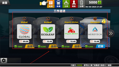 1、开始游戏后可查看当前可接任务,每个任务都会标明货物类型、卸货地点及里程单价,便于玩家做出最优选择。