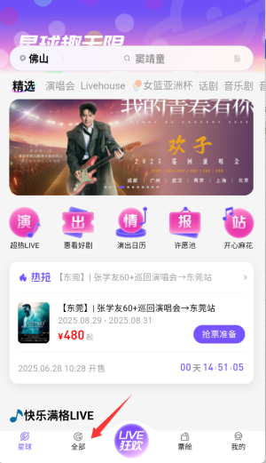 1、启动票星球APP后,在首页点击"全部"选项,浏览各类演出活动列表。