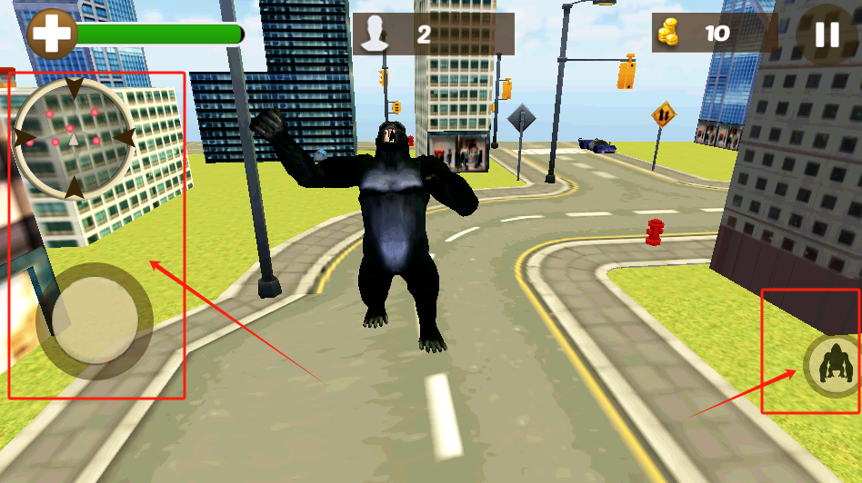 3、左下大圆键控制移动,右下猩猩键是攻击,注意上方血量和人数。