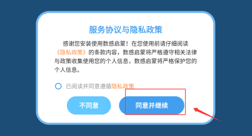 1、首次启动需阅读并确认使用协议,完成基础设置后即可进入启蒙学习界面。