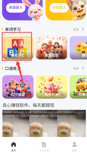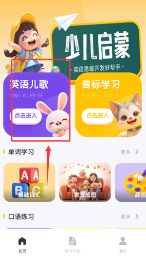 2、词汇认知模块运用视觉记忆原理,为每个基础单词设计生动插画和情境例句,帮助幼儿建立词汇与实物的直观联系。