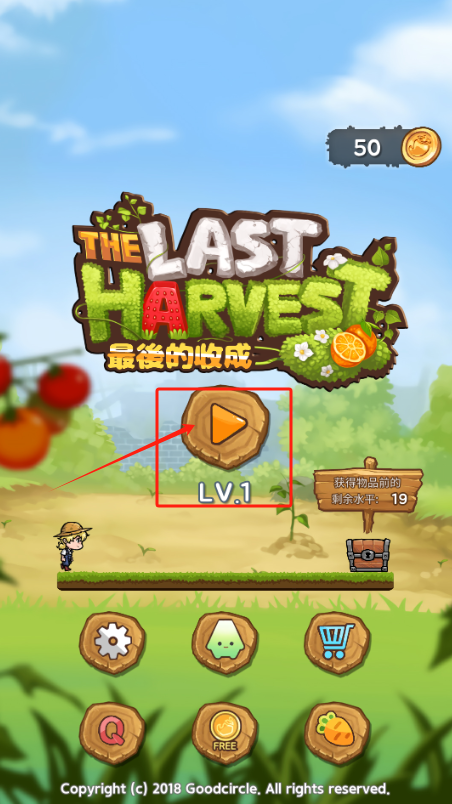 1、点红框LV.1开始游戏,金币显示50,背景是农田和小人。