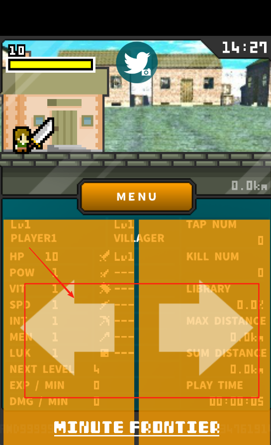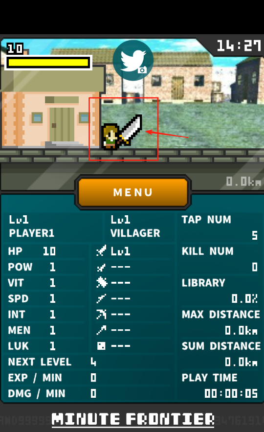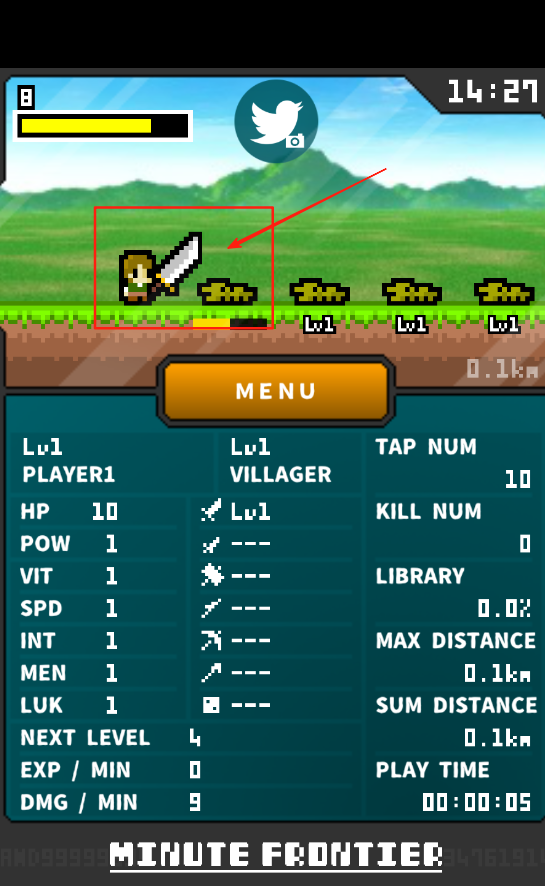 1、点MENU进菜单,角色是1级村民,生命值10,攻击力1,经验0。