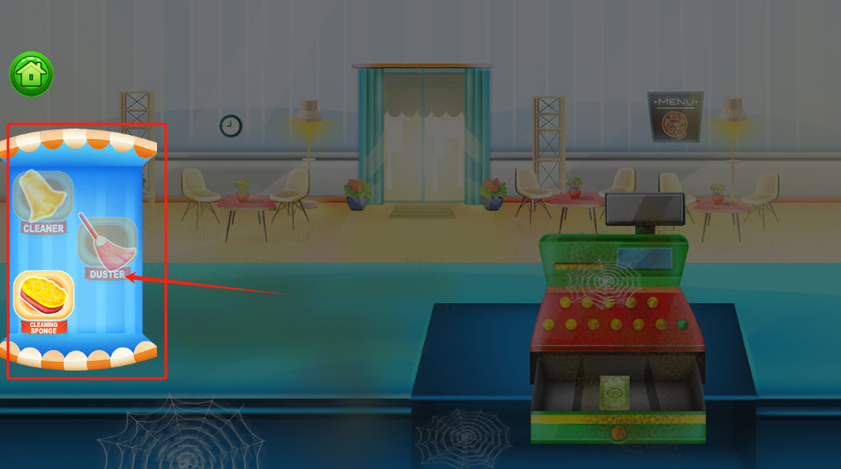 1、点右下角绿色按钮开始游戏,收银机显示15金币,Open表示营业中。