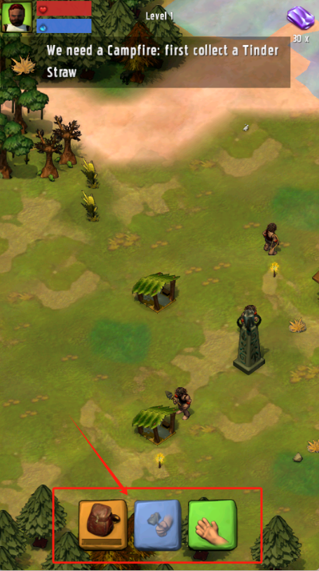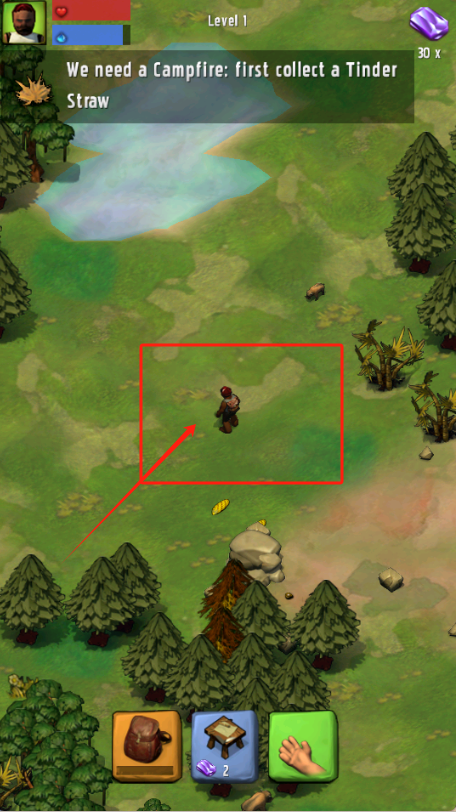 2、先收集30个引火草生篝火,红框是背包,任务和建造按钮。