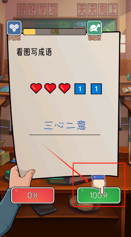3、这张三心二意的答案是对的,点右边绿色按钮打100分。