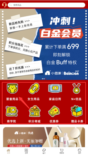 1、进入小恩家APP后,浏览首页商品分类,点击感兴趣的商品品类进入详情页。