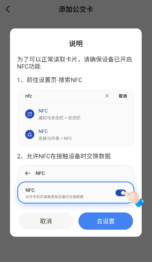2、进入"我的公交卡"页面,开启NFC功能后贴近实体公交卡,自动读取卡号并绑定,支持余额查询和在线充值。