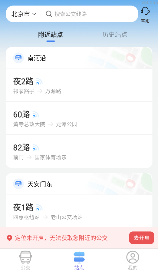 1、开启定位权限后,首页自动显示周边500米内所有公交站点,按距离排序并标注实时到站车辆。