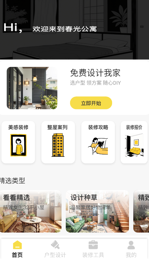 1、打开应用进入主界面,可浏览风格设计、全屋案例、家装指南及费用估算等实用功能,轻松获取装修灵感与知识。