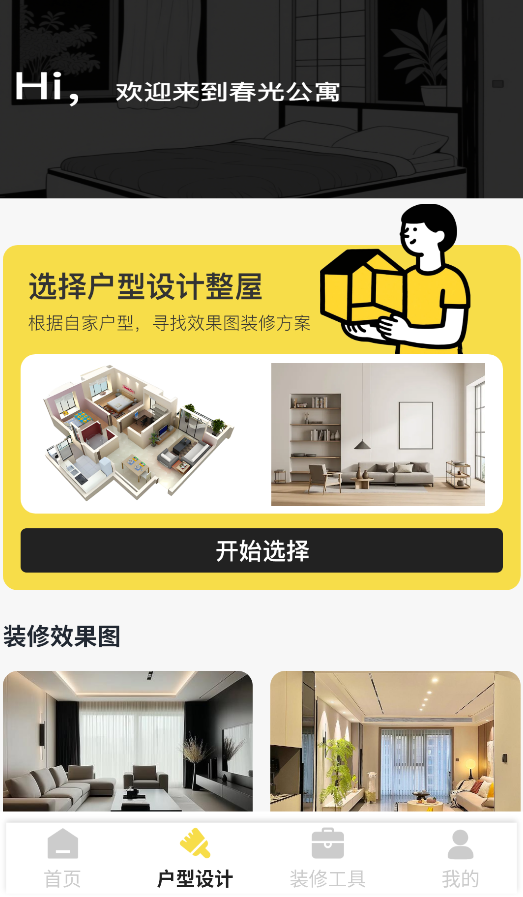 2、进入房型规划板块,既能参考精美实景效果图,也能自定义户型数据,快速生成个性化全屋设计方案。