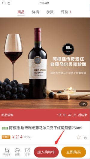 3、确认商品无误后,点击左下角"加入购物车"按钮即可暂存商品待结算。