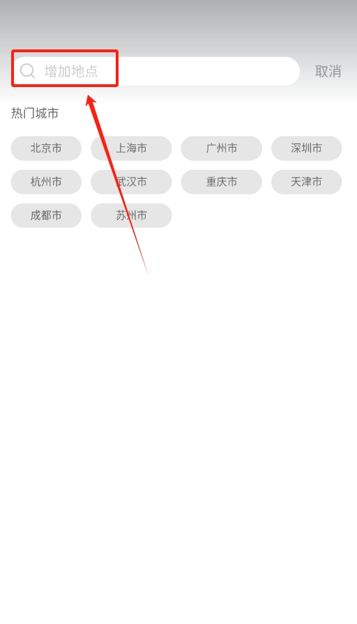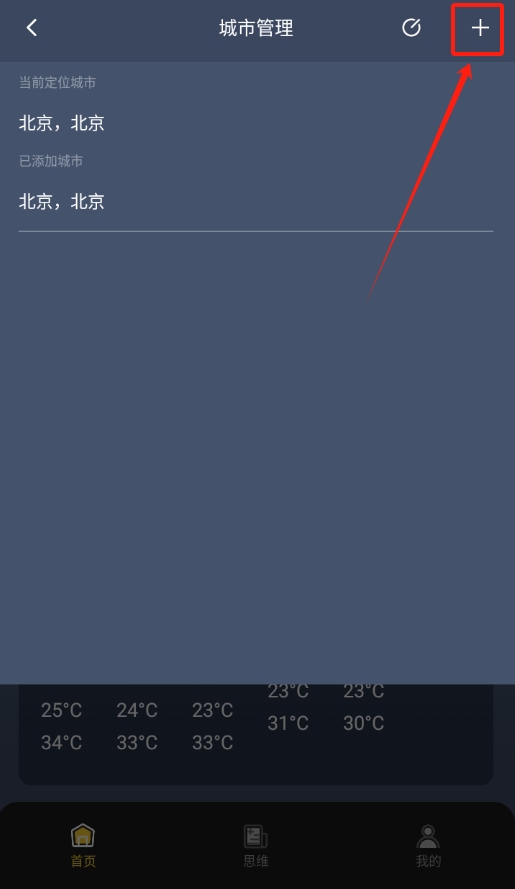 2、在弹出的菜单里点击右上角的加号按钮,准备输入你想关注的地方。