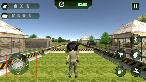 2、左侧为角色移动控制区域,右侧则是瞄准、射击、跳跃等功能按钮,结合摇杆与按键实现流畅操作。