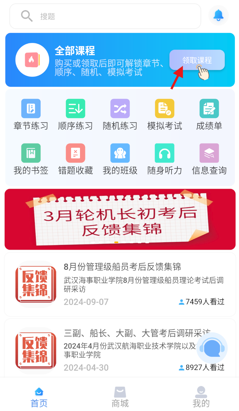 1、打开船员宝应用,在首页底部导航栏找到并点击 “领取课程” 选项。