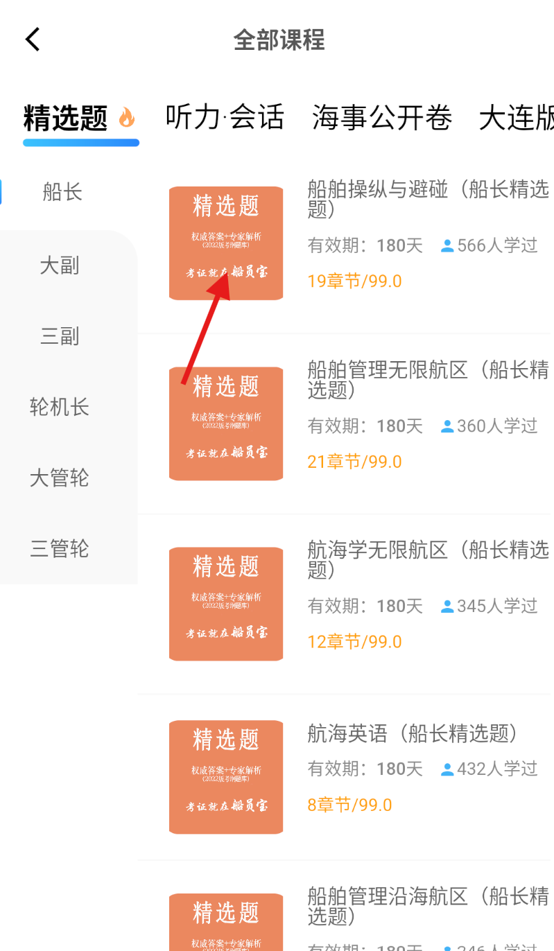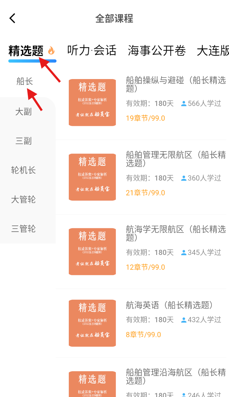 2、进入课程页面后,在分类中找到 “精选题” 板块,点击进入并选择 “船长” 类别。