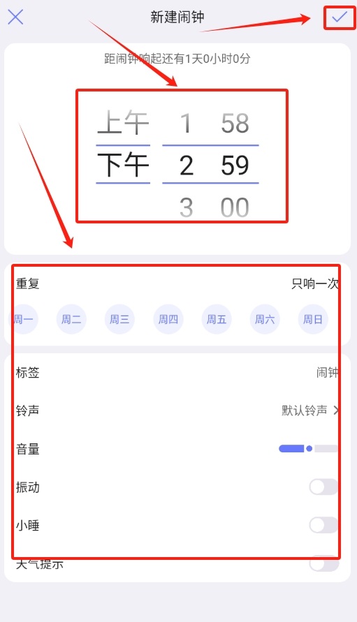 2、把想设置的时间、重复日期,还有喜欢的铃声都填好,再点右上角的勾号确认。