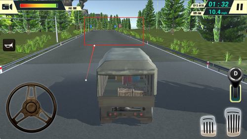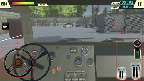 2、左侧控制方向与刹车,右侧操作油门与档位切换,屏幕上方显示导航信息和限速提示便于实时掌握路况。
