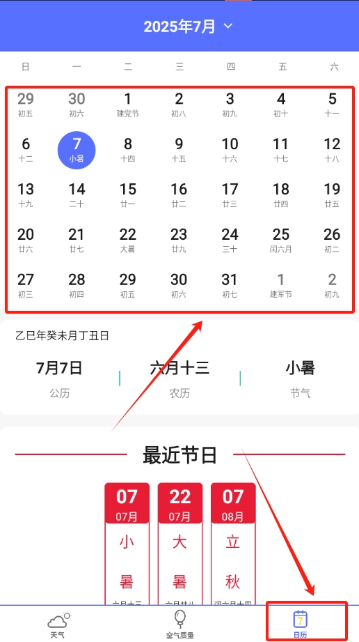 3、切换到日历页面,能看到日期和节日节气提醒,结合天气信息方便安排办事时间。