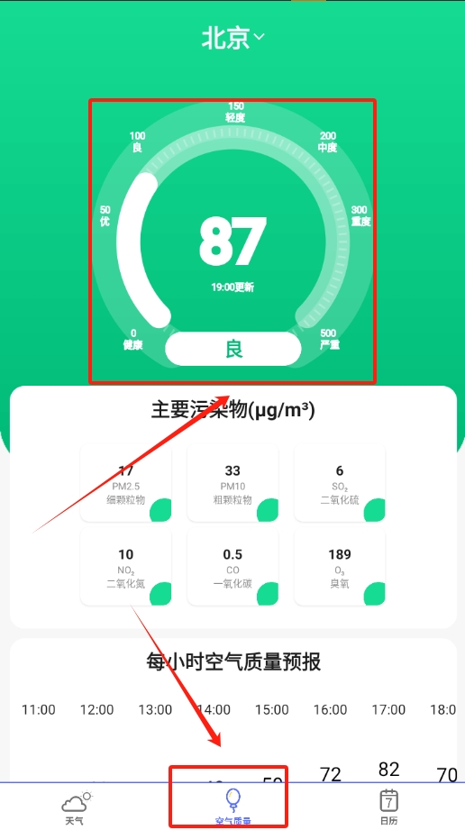 2、在软件里找到空气质量页面,点进去能看到 pm2.5 等详细数据,了解周围空气情况。