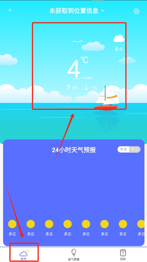 4、界面与自然天气相配合,清晰直观展示信息,24 小时天气预报及时更新,出门天气早知晓。