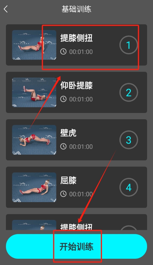 2、从这项运动里选一个特定的训练,比如瘦腿动作组合,点击开始训练就进入准备状态。