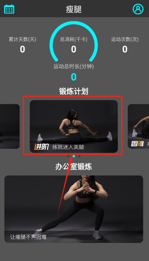 2、根据自身瘦腿目标和身体条件设置锻炼计划,在轻体课程中筛选瘦腿相关视频,跟着教练逐步学习标准动作要领。