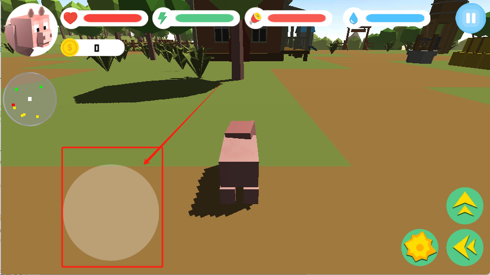 2、用红框里的方向键控制小猪移动,注意看上方状态条别饿着。