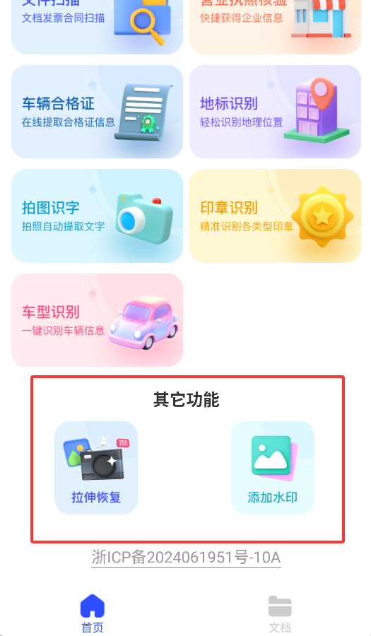 1、打开APP后,首页提供多种智能扫描功能,包括文件数字化、营业执照验证、图片文字提取及地点标识识别等实用工具。