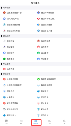 3、进入"综合服务"板块,使用社保查询、违章缴费等便民政务服务功能。