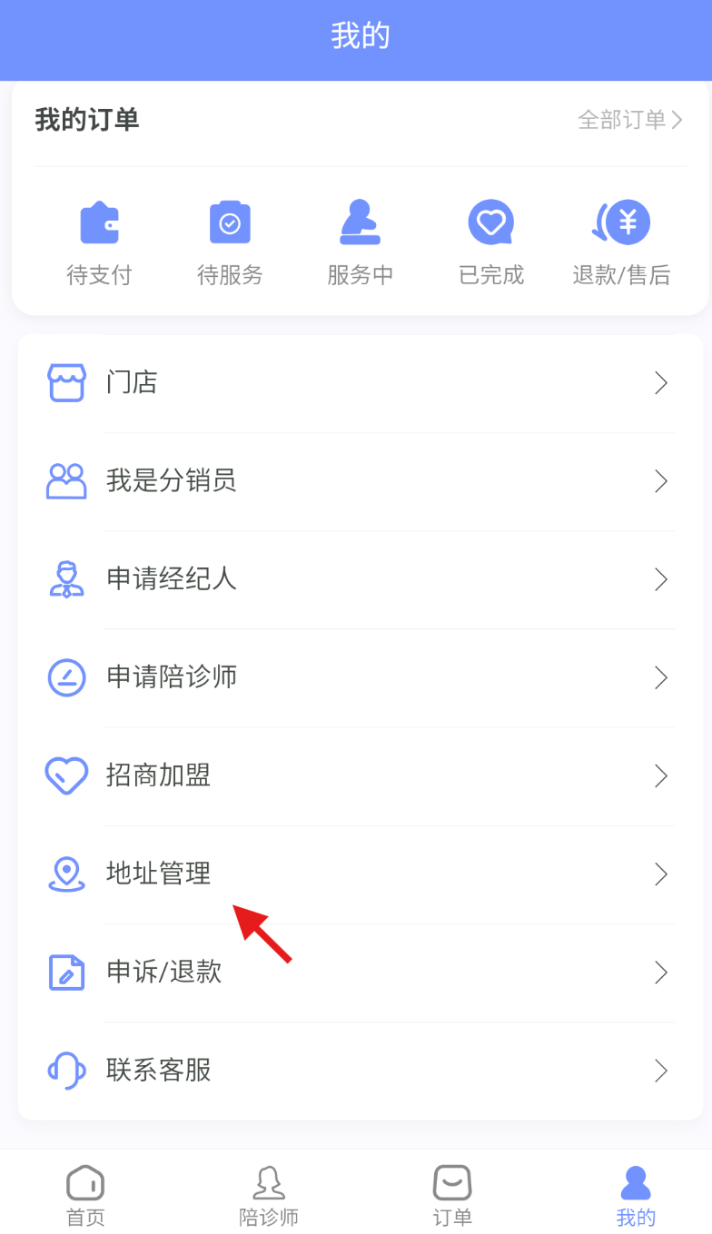 2、进入 “我的” 页面后,在显示的功能选项里找到 “地址管理”,点击进入地址相关的设置界面。