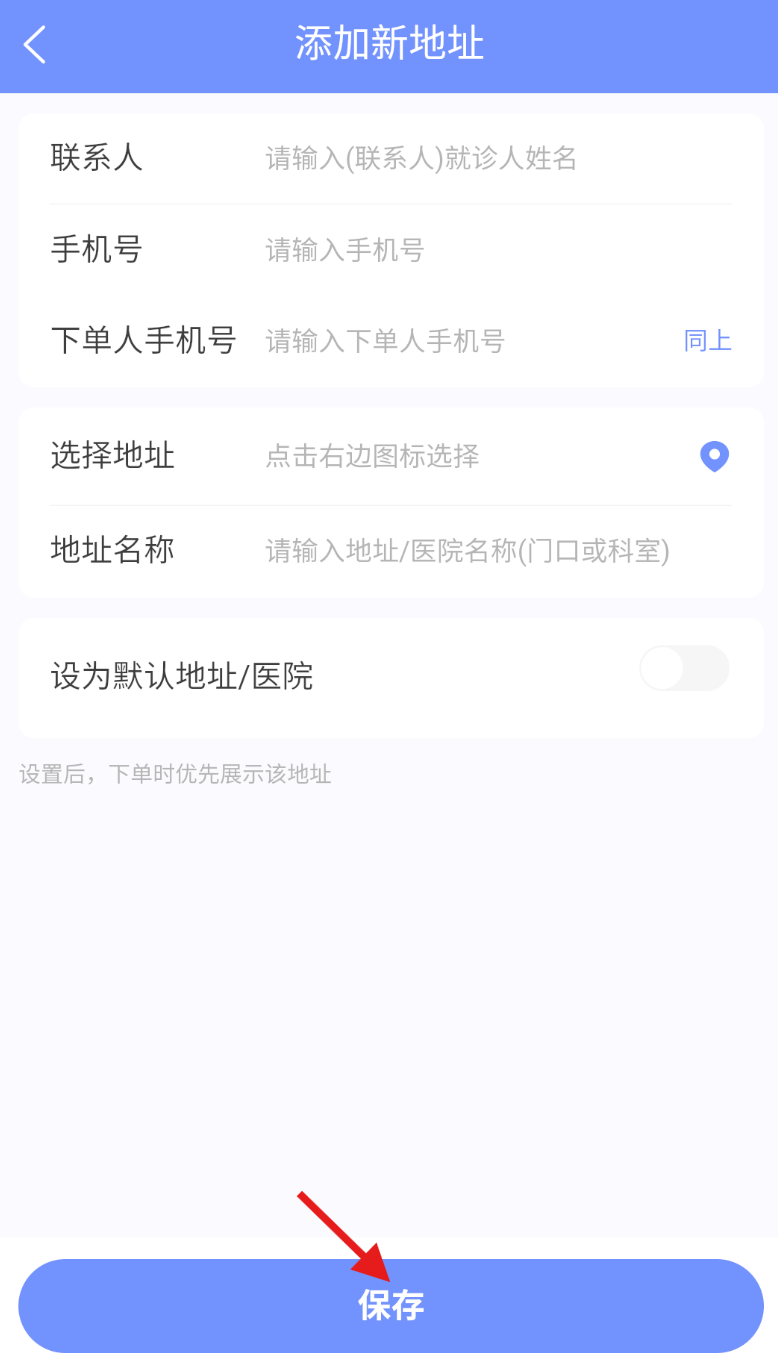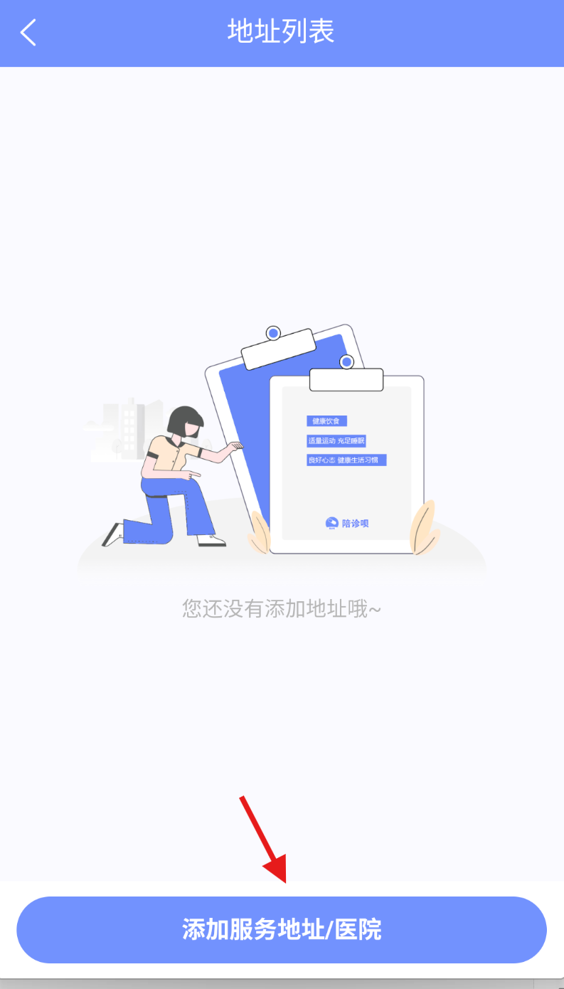 3、在地址管理界面中,找到 “添加服务地址 / 医院” 的选项并点击,进入信息填写页面。