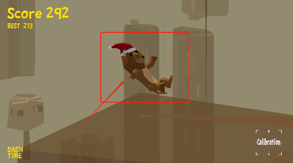 2、看小熊头顶分数和计时,点击屏幕控制它左右躲开绿色方块别掉下去。