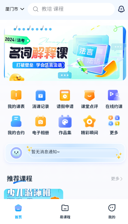 1、打开应用后,在首页可查看个人课程安排、上课记录、请假申请及教师评语等学习管理功能。