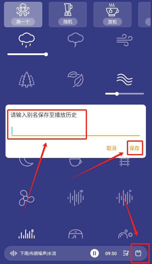 4、觉得某个自然音组合不错,点击右下角的保存图标,输入组合名字,就能保存到播放历史里,下次直接点进去就能听不用再找。