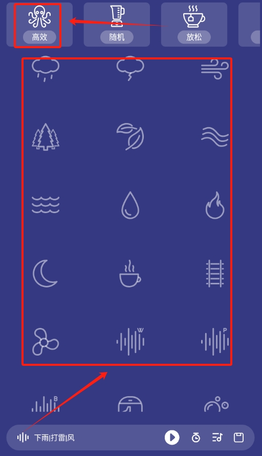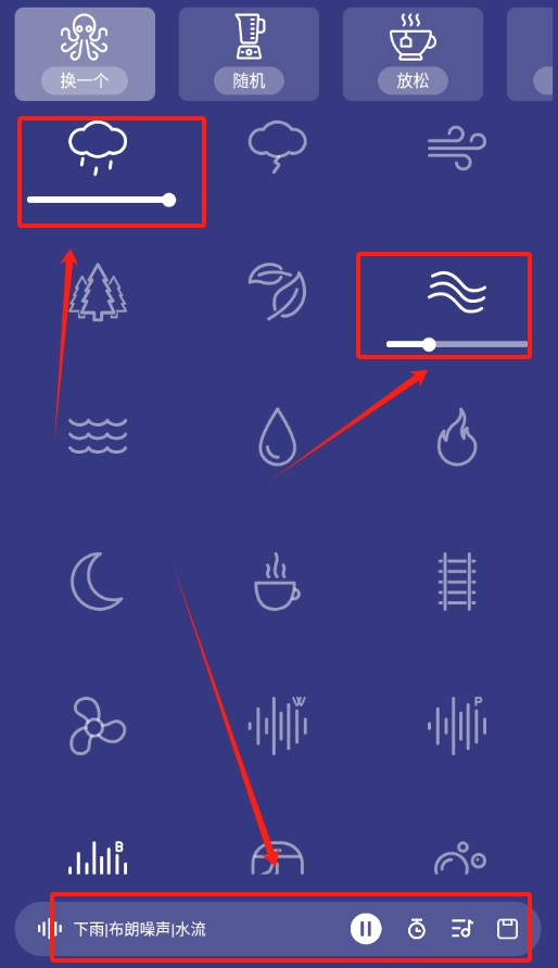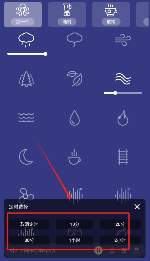 2、想试试不同自然音的搭配,点击顶部的小章鱼按键,软件会随机组合几个自然音播放,说不定能发现更适合自己的助眠声音。