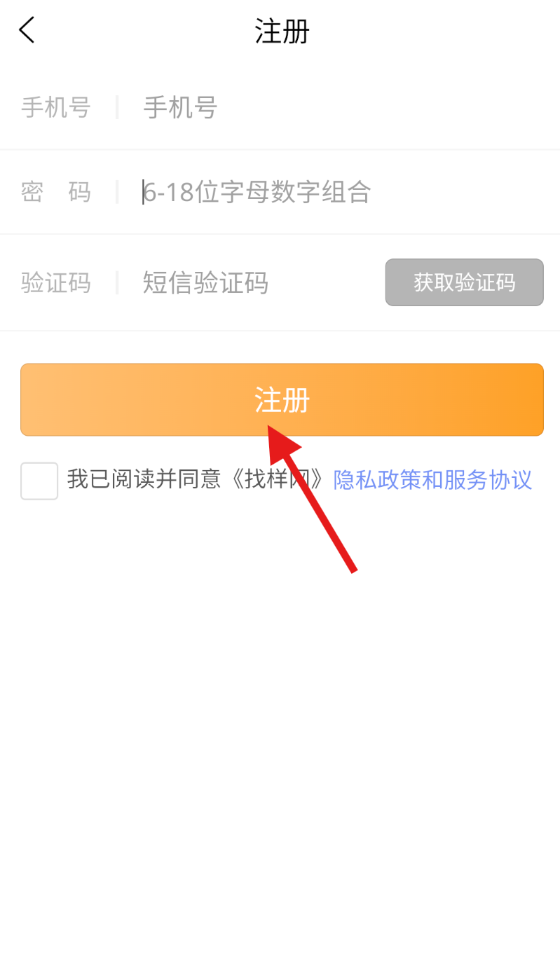 3、在注册界面中,依次输入手机号、设置密码并填写收到的验证码,完成后点击注册按钮。