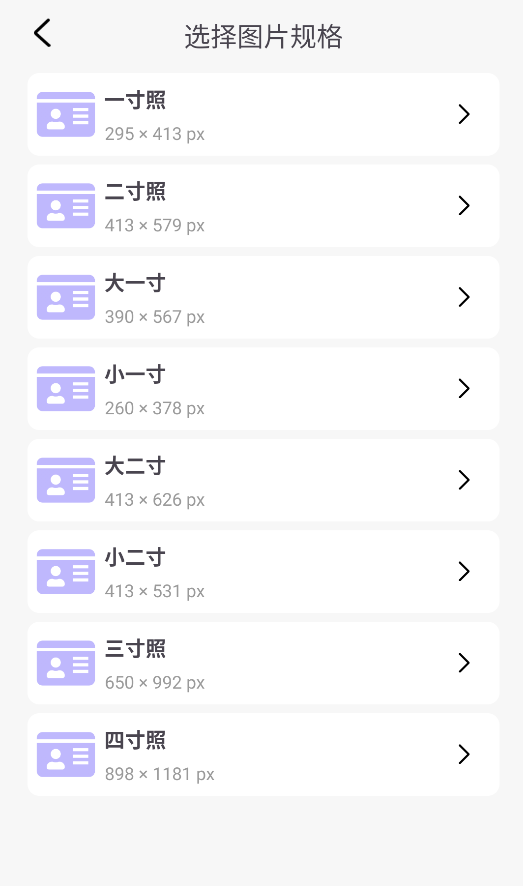 2、进入规格选择页,按需切换一寸、二寸等标准尺寸,应用会实时调整裁剪比例和分辨率。