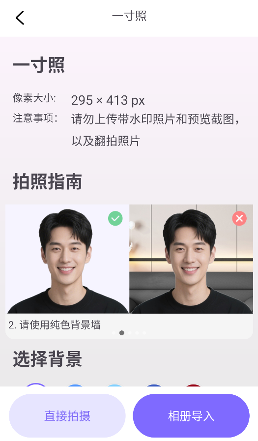 3、选择"直接拍摄"后,系统会智能引导构图(如对齐参考线),或导入相册图片自动抠图换背景,生成合规证件照。